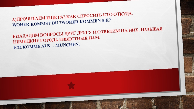 Слайд 4А)Прочитаем еще раз как спросить кто откуда. Woher kommst du ?Woher
