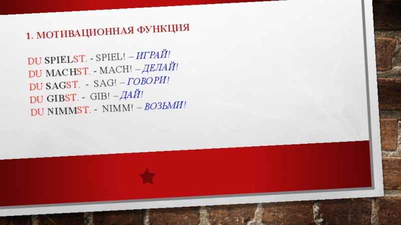 1. Мотивационная функция  Du spielst. - Spiel! – Играй! Du machst. - Mach! – Делай! Du sagst.  -  Sag! – Говори! Du gibst.