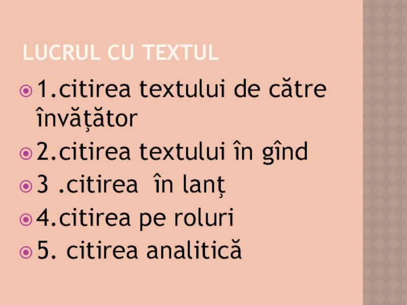 Lucrul cu textul1.citirea textului de către învăţător2.citirea textului în gînd3 .citirea în lanţ4.citirea pe roluri5. citirea analitică
