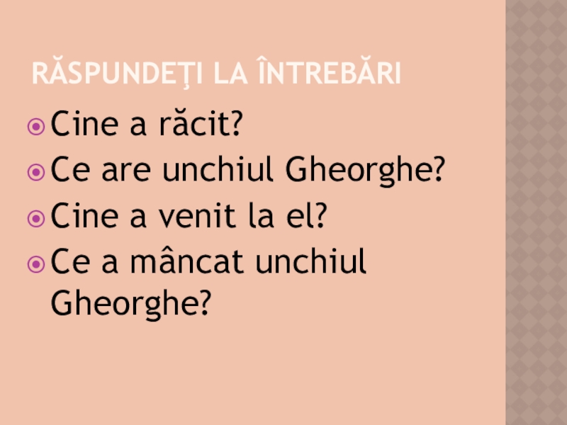 Răspundeţi la întrebăriCine a răcit?Ce are unchiul Gheorghe?Cine a venit la el?Ce a mâncat unchiul Gheorghe?