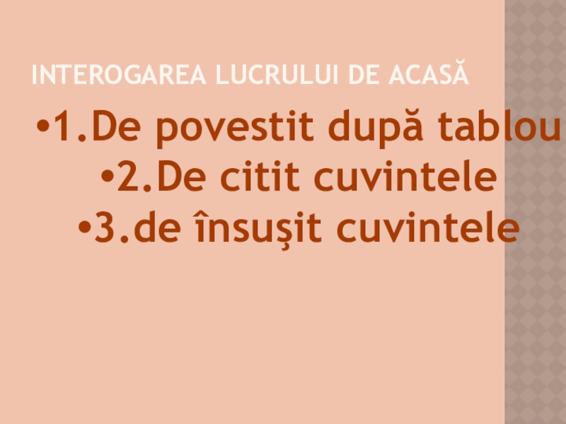 Interogarea lucrului de acasă1.De povestit după tablou2.De citit cuvintele3.de însuşit cuvintele