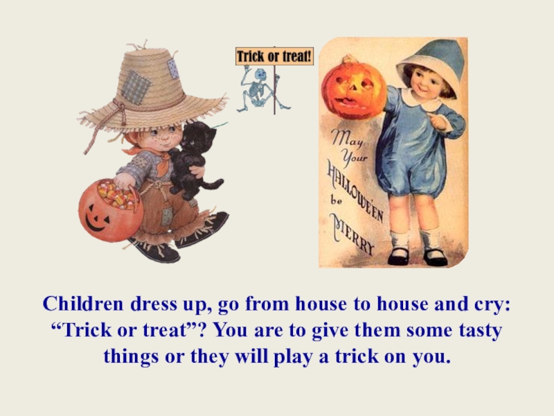 Слайд 7 Children dress up, go from house to house and cry: “Trick