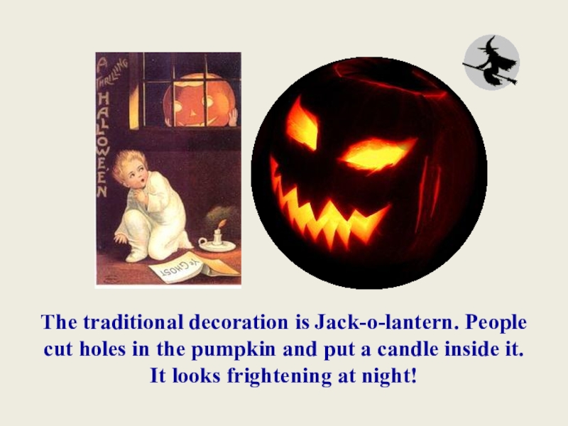 Слайд 6The traditional decoration is Jack-o-lantern. People cut holes in the pumpkin
