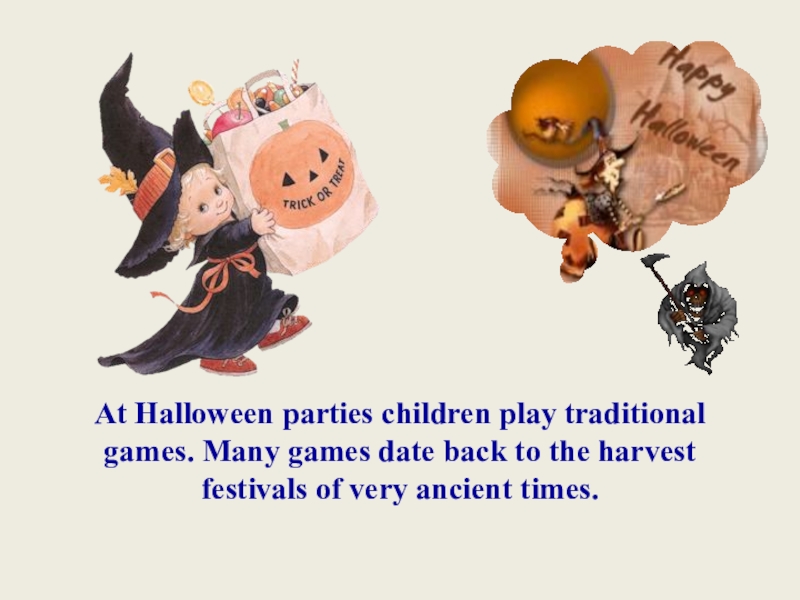 Слайд 9At Halloween parties children play traditional games. Many games date back