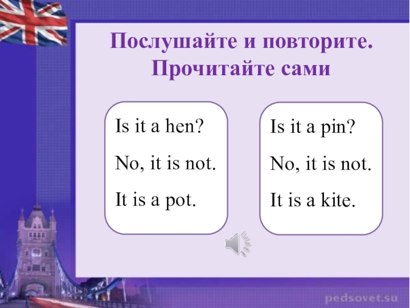 Послушайте и повторите. Прочитайте самиIs it a hen?No, it is not.It is a pot.Is it a pin?No,