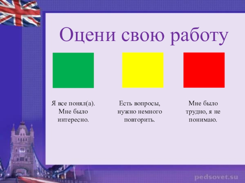 Оцени свою работуЯ все понял(а).Мне было интересно.Есть вопросы, нужно немного повторить.Мне было трудно, я не понимаю.