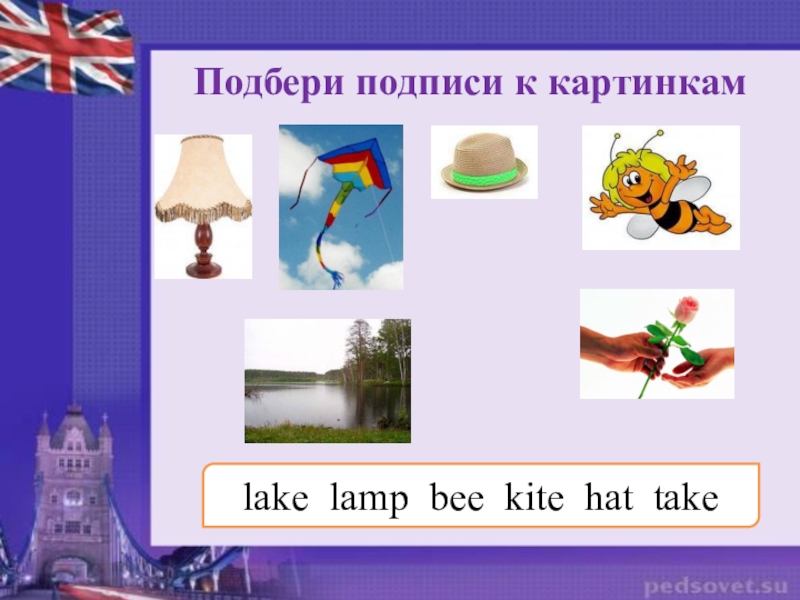 Подбери подписи к картинкамlake lamp bee kite hat take