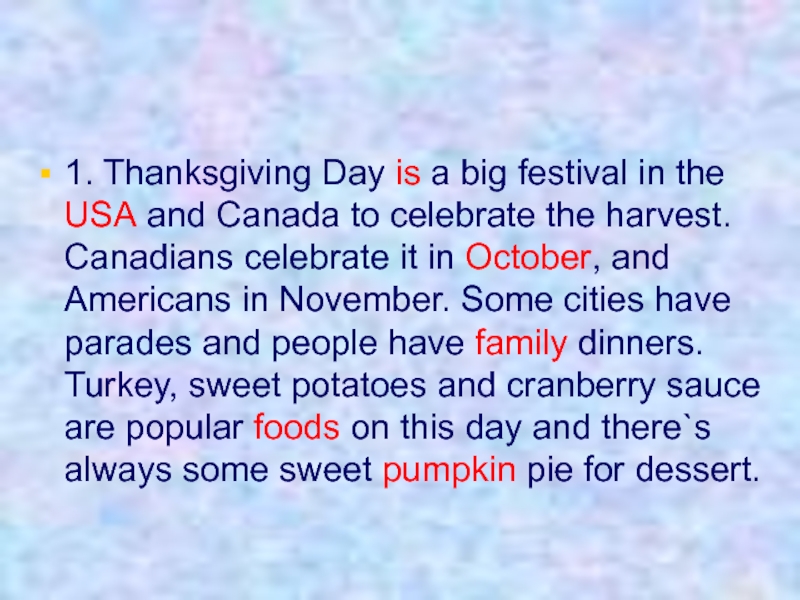 Canada to celebrate the harvest. Canadians celebrate it in October, and Americans in November. Some cities have parades and people have family dinners. Turkey, sweet potatoes and cranberry sauce are popular foods on this day and there`s always some sweet pumpkin pie for dessert.