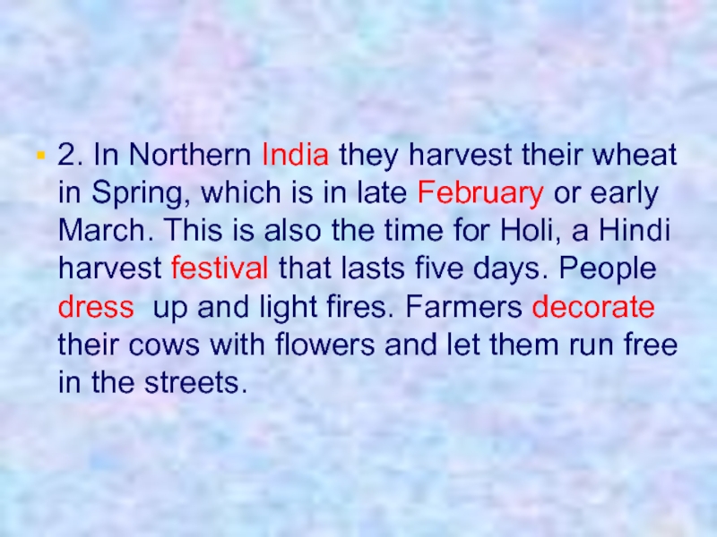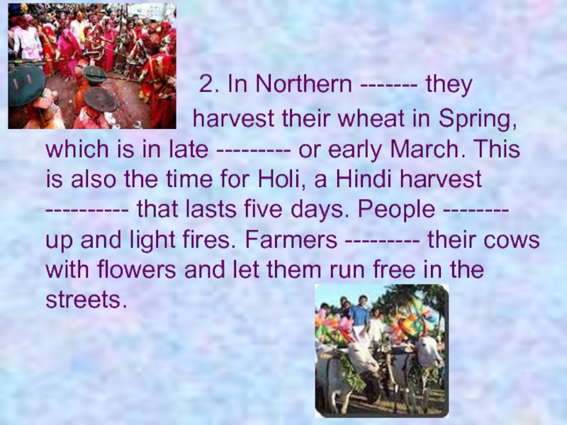 harvest their wheat in Spring, which is in late --------- or early March. This is also the time for Holi, a Hindi harvest ---------- that lasts five days. People -------- up and light fires. Farmers --------- their cows with flowers and let them run free in the streets.