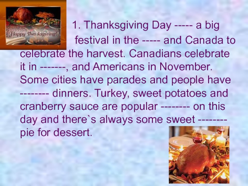 festival in the ----- and Canada to celebrate the harvest. Canadians celebrate it in -------, and Americans in November. Some cities have parades and people have -------- dinners. Turkey, sweet potatoes and cranberry sauce are popular -------- on this day and there`s always some sweet -------- pie for dessert.