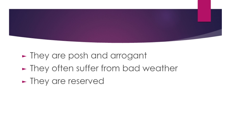 They are posh and arrogantThey often suffer from bad weatherThey are reserved