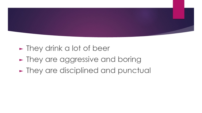 They drink a lot of beerThey are aggressive and boringThey are disciplined and punctual