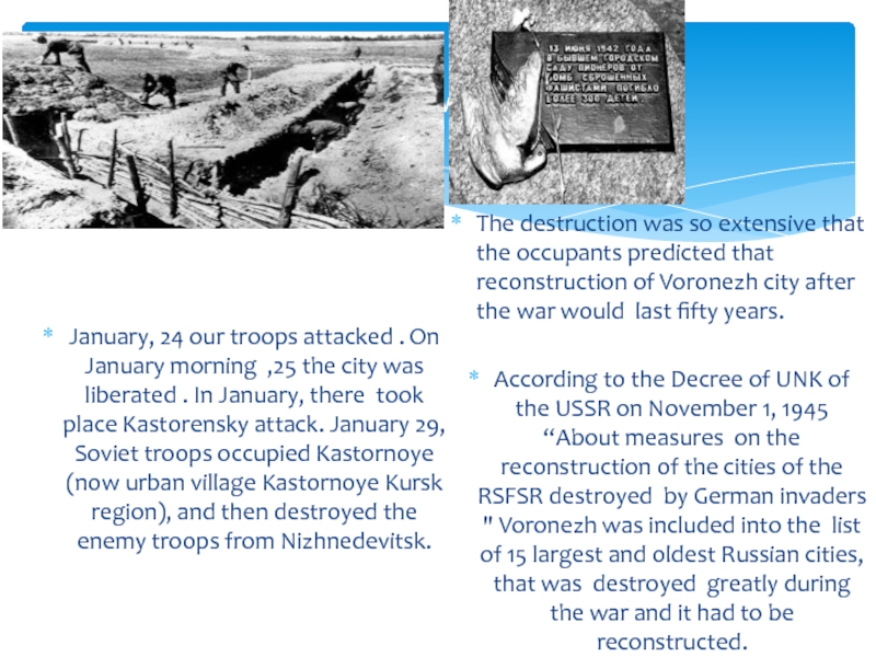 According to the Decree of UNK of the USSR on November 1, 1945 “About measures on the reconstruction of the cities of the RSFSR destroyed by German invaders " Voronezh was included into the list of 15 largest and oldest Russian cities, that was destroyed greatly during the war and it had to be reconstructed.