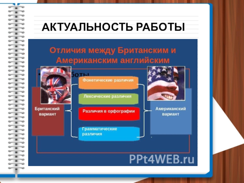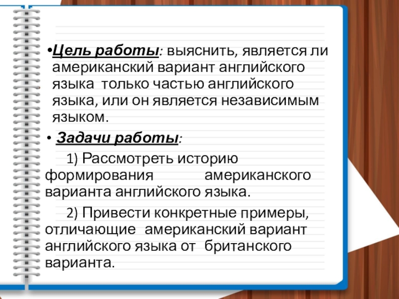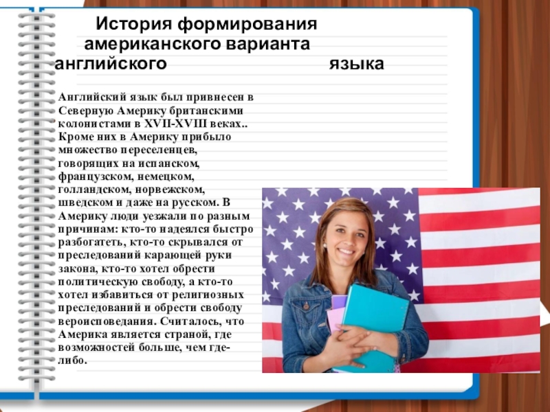 Английский язык был привнесен в Северную Америку британскими колонистами в XVII-XVIII веках.. Кроме них в Америку прибыло множество переселенцев, говорящих на испанском, французском, немецком, голландском, норвежском, шведском и даже на русском. В Америку люди уезжали по разным причинам: кто-то надеялся быстро разбогатеть, кто-то скрывался от преследований карающей руки закона, кто-то хотел обрести политическую свободу, а кто-то хотел избавиться от религиозных преследований и обрести свободу вероисповедания. Считалось, что Америка является страной, где возможностей больше, чем где-либо.