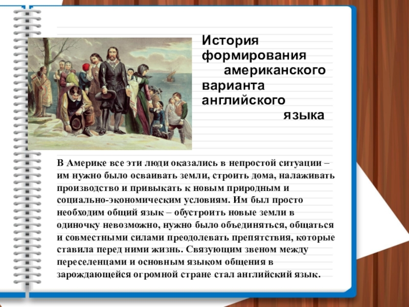 В Америке все эти люди оказались в непростой ситуации – им нужно было осваивать земли, строить дома, налаживать производство и привыкать к новым природным и социально-экономическим условиям. Им был просто необходим общий язык – обустроить новые земли в одиночку невозможно, нужно было объединяться, общаться и совместными силами преодолевать препятствия, которые ставила перед ними жизнь. Связующим звеном между переселенцами и основным языком общения в зарождающейся огромной стране стал английский язык.