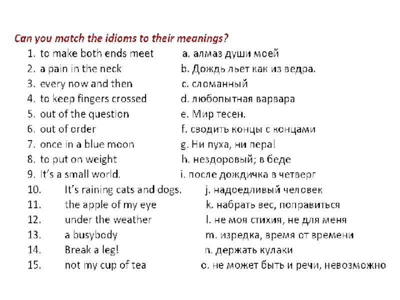 Idioms are special phrases that have their own meaning. For example: when we say that something is « a piece of cake» , we mean that its very easy.