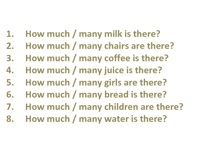 How much / many milk is there?How much / many chairs are there?How much / many coffee