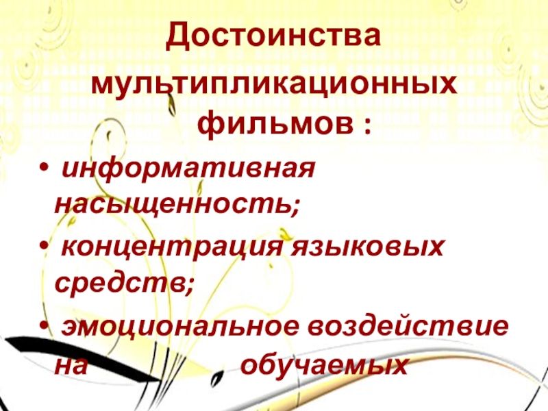 Достоинства  мультипликационных фильмов : информативная насыщенность; концентрация языковых средств; эмоциональное воздействие на