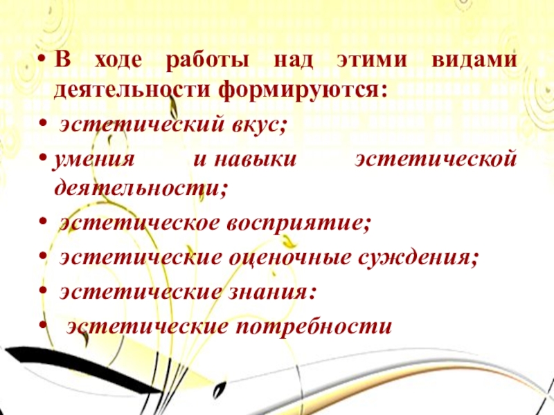 В ходе работы над этими видами деятельности формируются: эстетический вкус; умения и навыки эстетической деятельности; эстетическое восприятие; эстетические