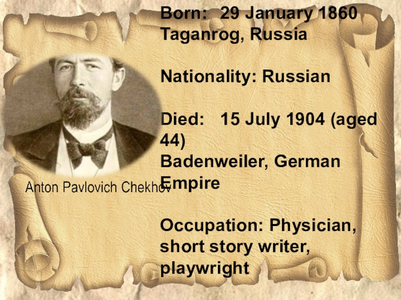 Born: 29 January 1860 Taganrog, Russia Nationality: Russian Died: 15 July 1904 (aged 44) Badenweiler, German Empire Occupation: Physician, short story writer, playwright