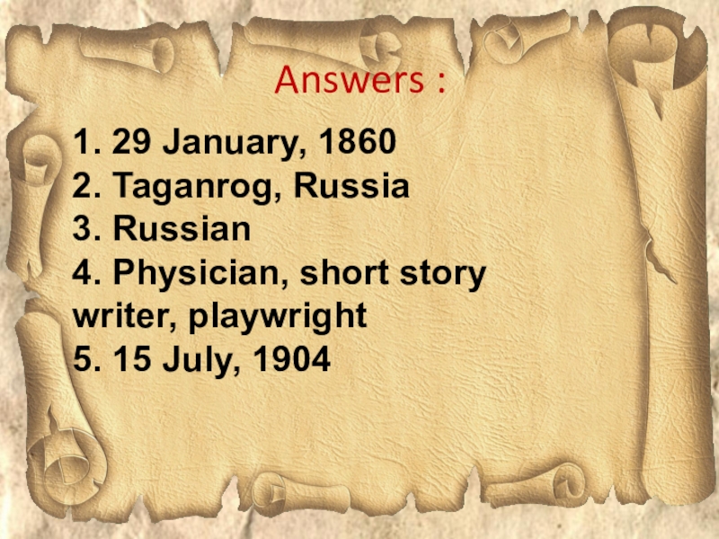 Answers :1. 29 January, 18602. Taganrog, Russia3. Russian4. Physician, short story writer, playwright5. 15 July, 1904