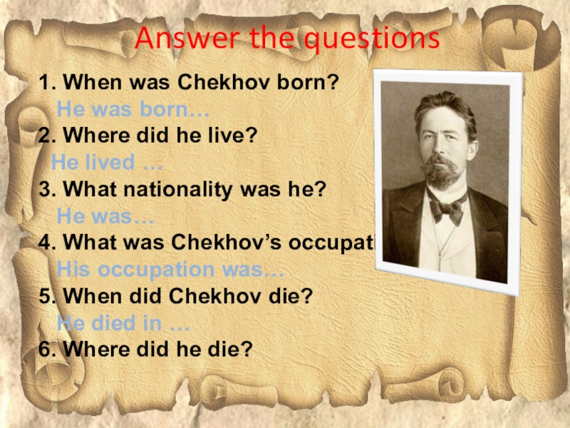 Answer the questions1. When was Chekhov born?  He was born…2. Where did he live? He lived