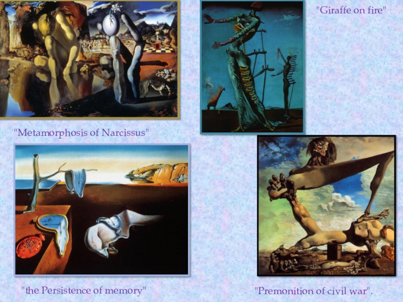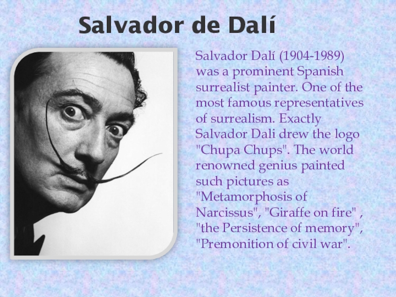painter. One of the most famous representatives of surrealism. Exactly Salvador Dali drew the logo "Chupa Chups". The world renowned genius painted such pictures as "Metamorphosis of Narcissus", "Giraffe on fire" , "the Persistence of memory", "Premonition of civil war".