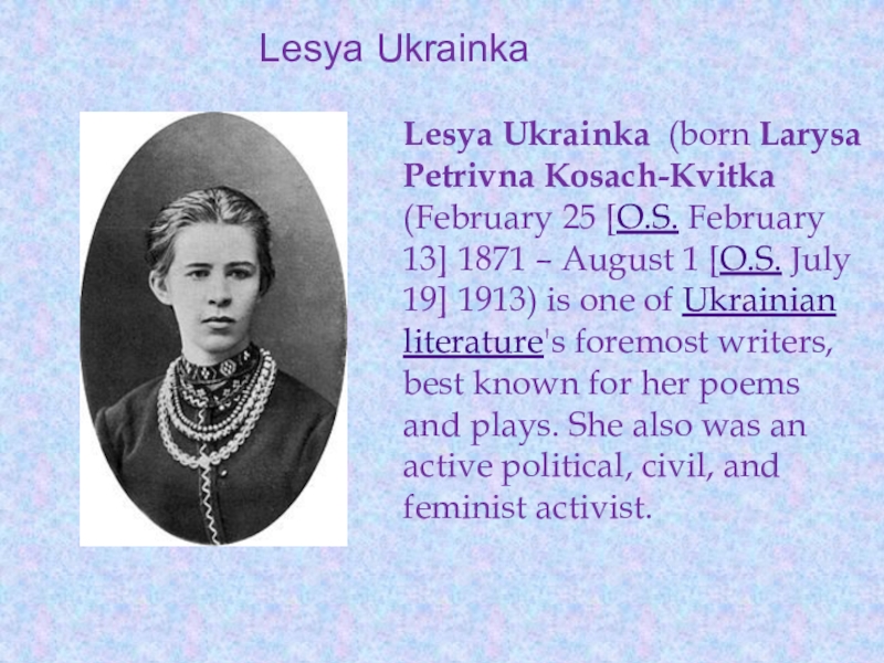 Lesya UkrainkaLesya Ukrainka  (born Larysa Petrivna Kosach-Kvitka  (February 25 [O.S. February 13] 1871 – August 1 [O.S. July 19] 1913) is one of Ukrainian literature's