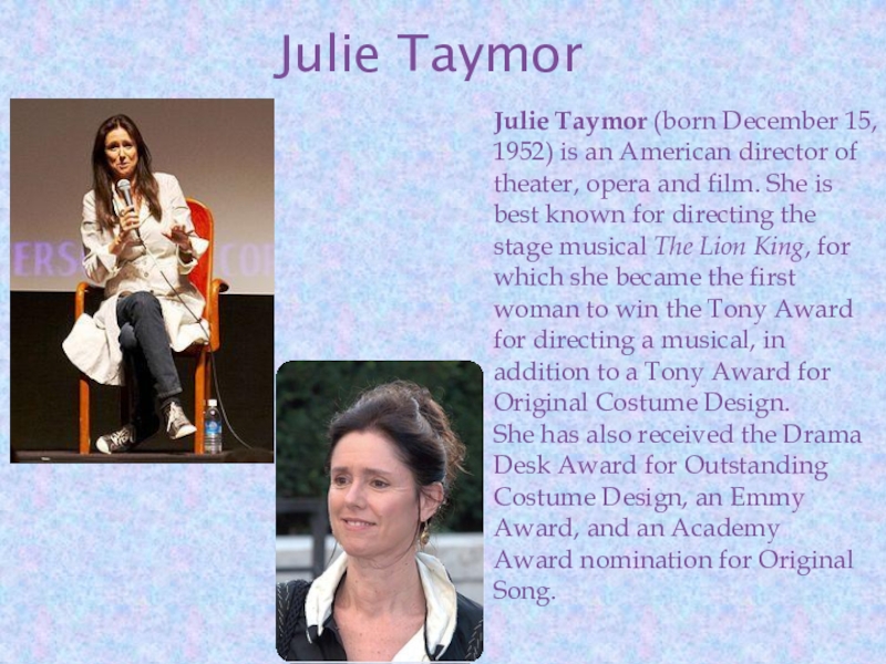 Julie TaymorJulie Taymor (born December 15, 1952) is an American director of theater, opera and film. She is