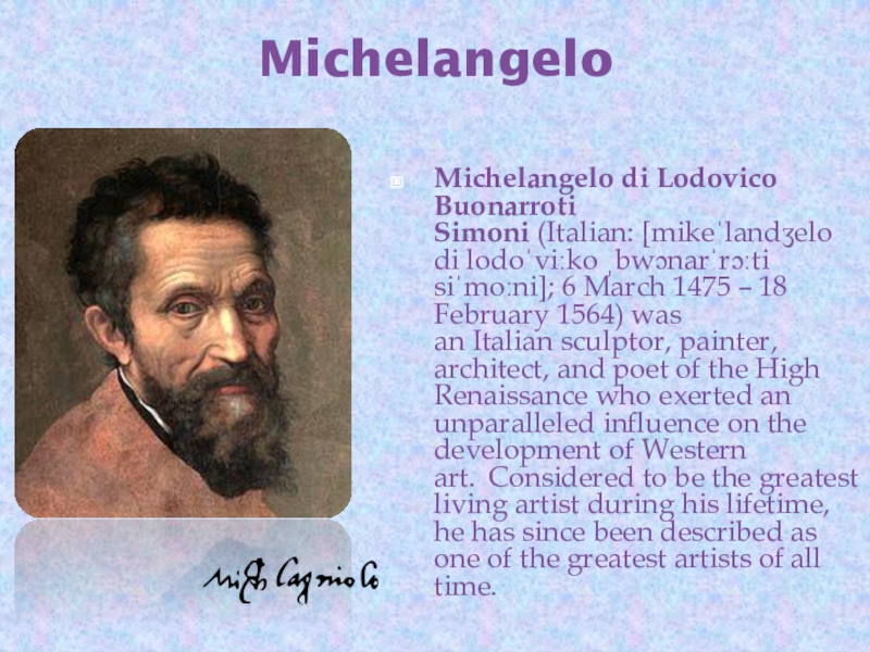 MichelangeloMichelangelo di Lodovico Buonarroti Simoni (Italian: [mikeˈlandʒelo di lodoˈviːko ˌbwɔnarˈrɔːti siˈmoːni]; 6 March 1475 – 18 February 1564) was