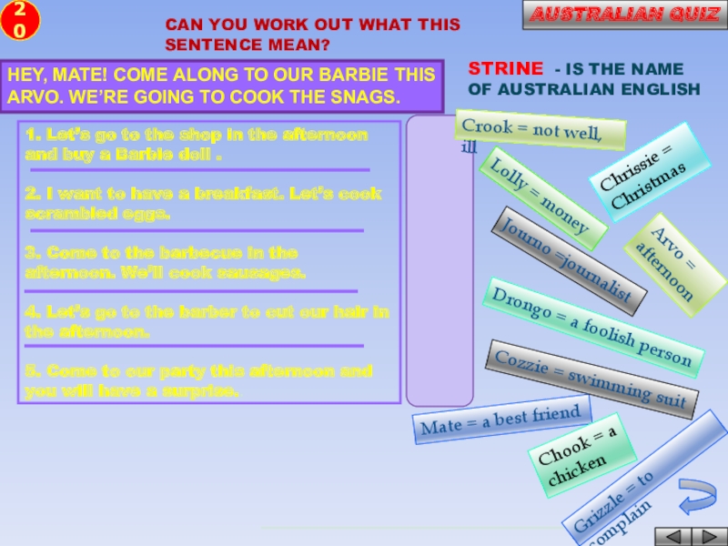 HEY, MATE! СОМЕ ALONG TO OUR BARBIE THIS ARVO. WE’RE GOING TO COOK THE SNAGS.