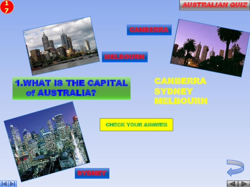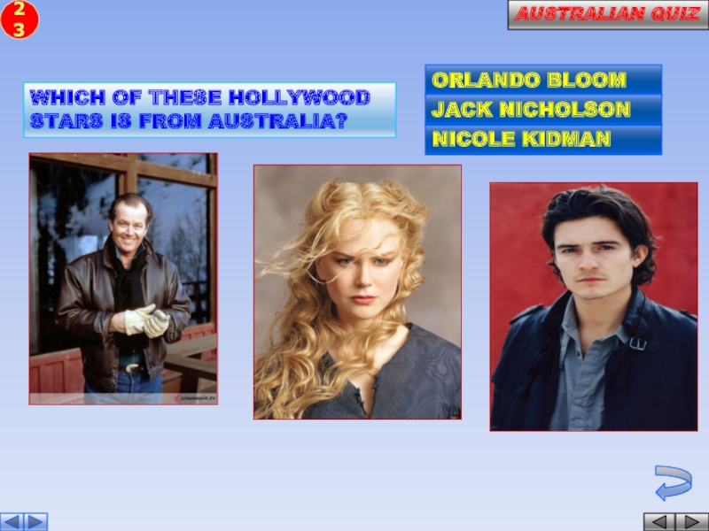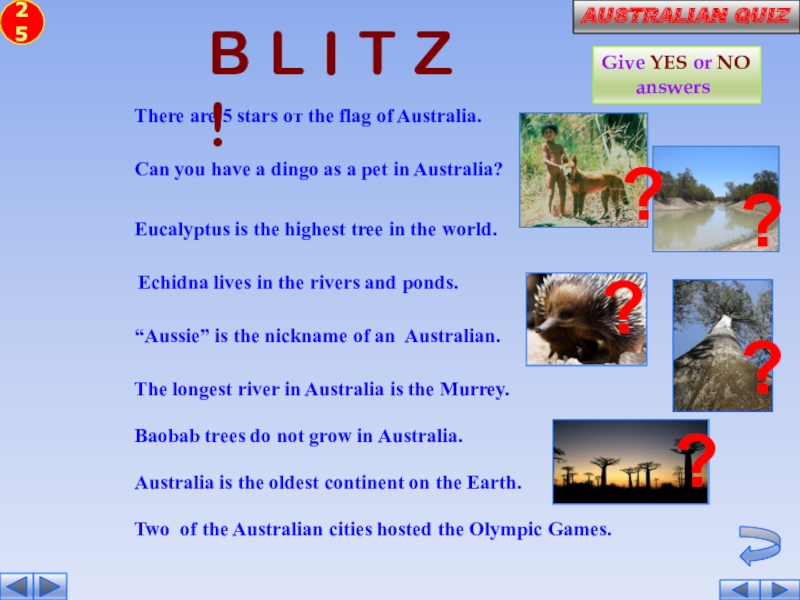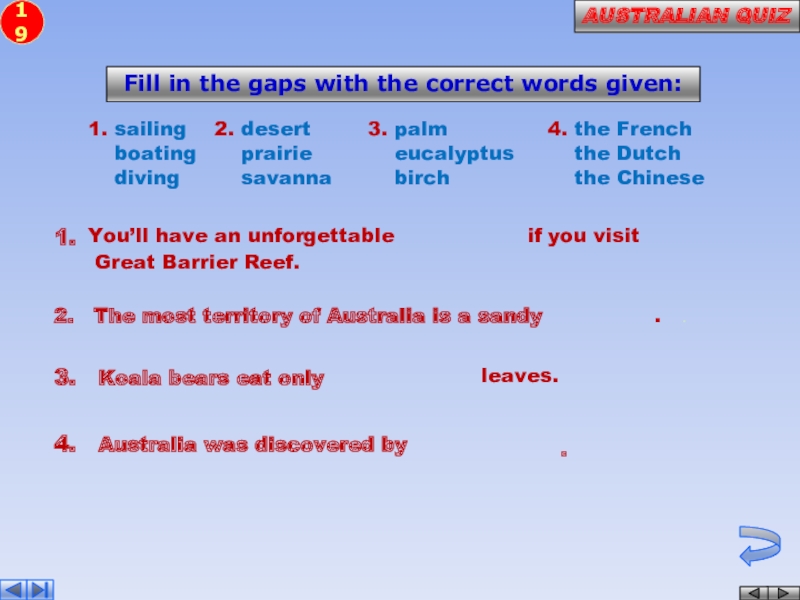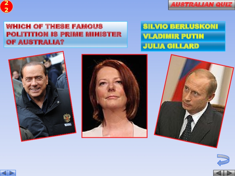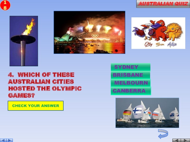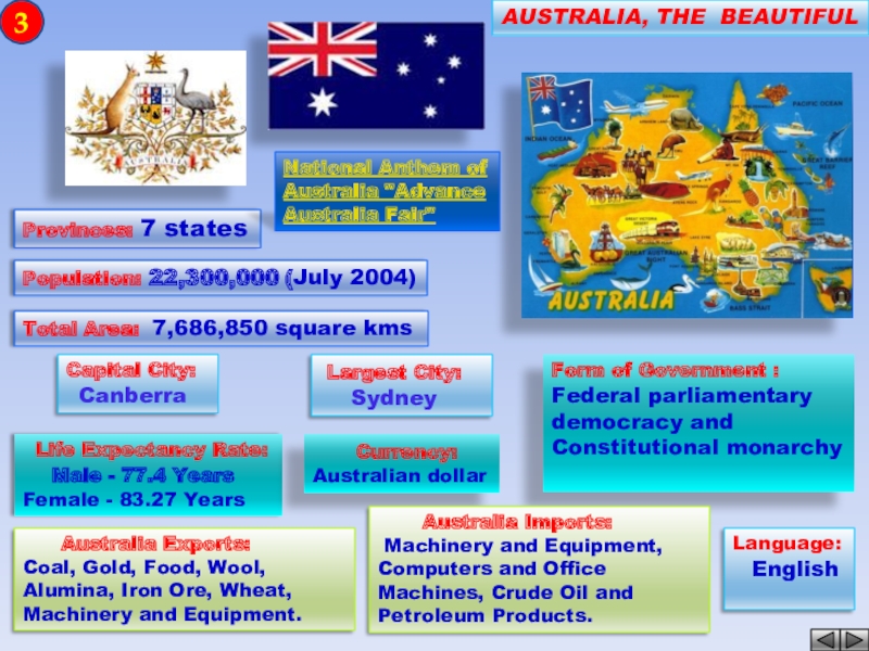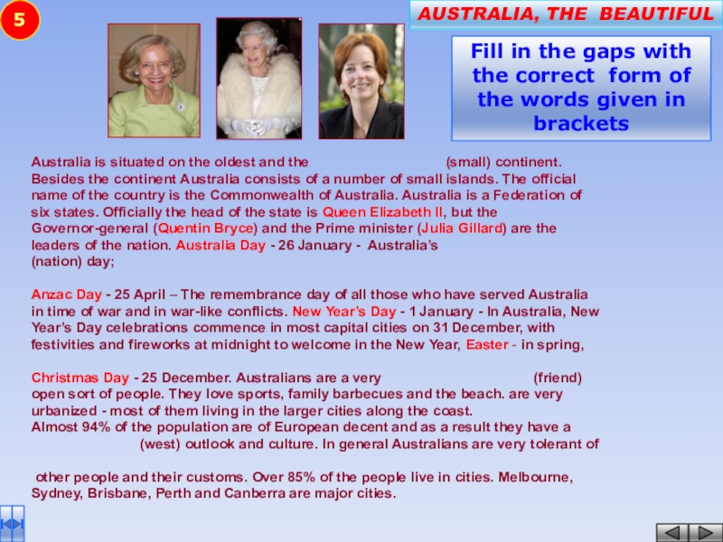 Australia is situated on the oldest and the (small) соntinent. Besides the continent Australia consists of a number of small islands. The official name of the country is the Commonwealth of Australia. Australia is a Federation of six states. Officially the head of the state is Queen Elizabeth II, but the Governor-general (Quentin Bryce) and the Prime minister (Julia Gillard) are the leaders of the nation. Australia Day - 26 January - Australia’s (nation) day;