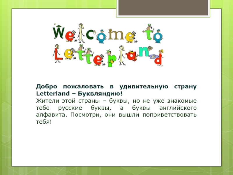 Слайд 2Добро пожаловать в удивительную страну Letterland – Буквляндию!