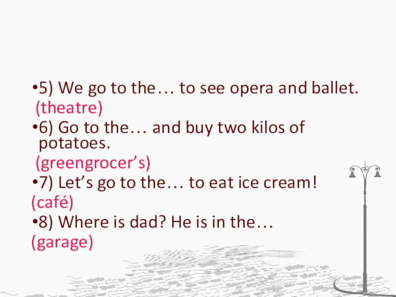 5) We go to the… to see opera and ballet. (theatre)6) Go to the… and buy two