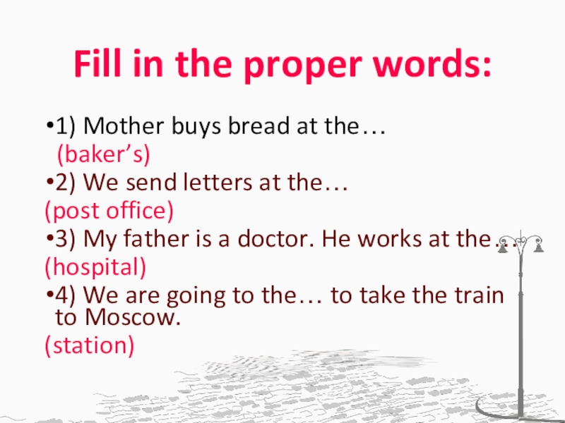 Fill in the proper words:1) Mother buys bread at the…  (baker’s)2) We send letters at the…(post