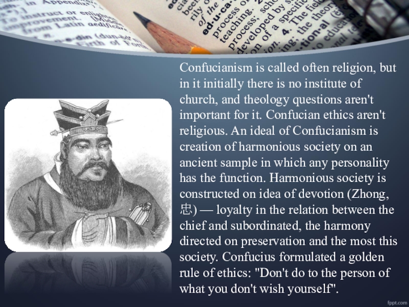 it initially there is no institute of church, and theology questions aren't important for it. Confucian ethics aren't religious. An ideal of Confucianism is creation of harmonious society on an ancient sample in which any personality has the function. Harmonious society is constructed on idea of devotion (Zhong, 忠) — loyalty in the relation between the chief and subordinated, the harmony directed on preservation and the most this society. Confucius formulated a golden rule of ethics: "Don't do to the person of what you don't wish yourself".
