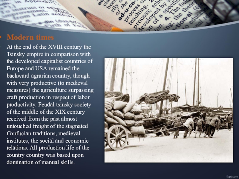 in comparison with the developed capitalist countries of Europe and USA remained the backward agrarian country, though with very productive (to medieval measures) the agriculture surpassing craft production in respect of labor productivity. Feudal tsinsky society of the middle of the XIX century received from the past almost untouched freight of the stagnated Confucian traditions, medieval institutes, the social and economic relations. All production life of the country country was based upon domination of manual skills.