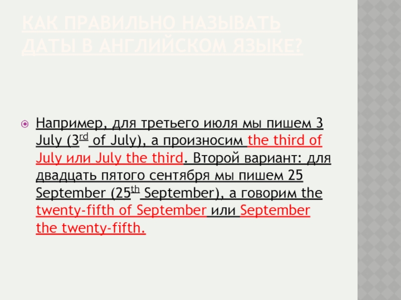 July (3rd of July), а произносим the third of July или July the third. Второй вариант: для двадцать пятого сентября мы пишем 25 September (25th September), а говорим the twenty-fifth of September или September the twenty-fifth.