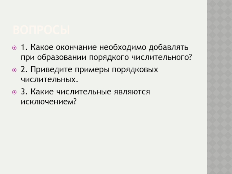 ВОПРОСЫ1. Какое окончание необходимо добавлять при образовании порядкого числительного?2. Приведите примеры порядковых числительных.3. Какие числительные являются исключением?