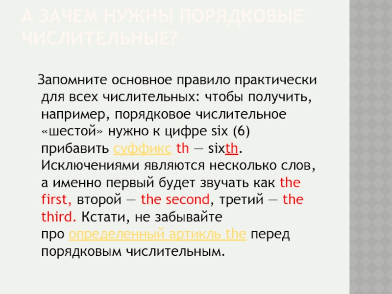 А ЗАЧЕМ НУЖНЫ ПОРЯДКОВЫЕ ЧИСЛИТЕЛЬНЫЕ? Запомните основное правило практически для всех числительных: чтобы получить, например, порядковое числительное «шестой» нужно к цифре six (6) прибавить суффикс th — sixth. Исключениями являются несколько слов, а именно первый будет звучать как the first, второй