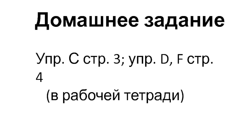 Домашнее заданиеУпр. С стр. 3; упр. D, F стр. 4  (в рабочей тетради)
