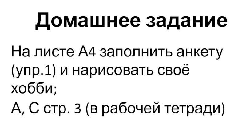 Домашнее заданиеНа листе А4 заполнить анкету (упр.1) и нарисовать своё хобби;А, С стр. 3 (в рабочей тетради)