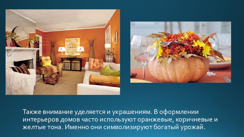оранжевые, коричневые и желтые тона. Именно они символизируют богатый урожай.