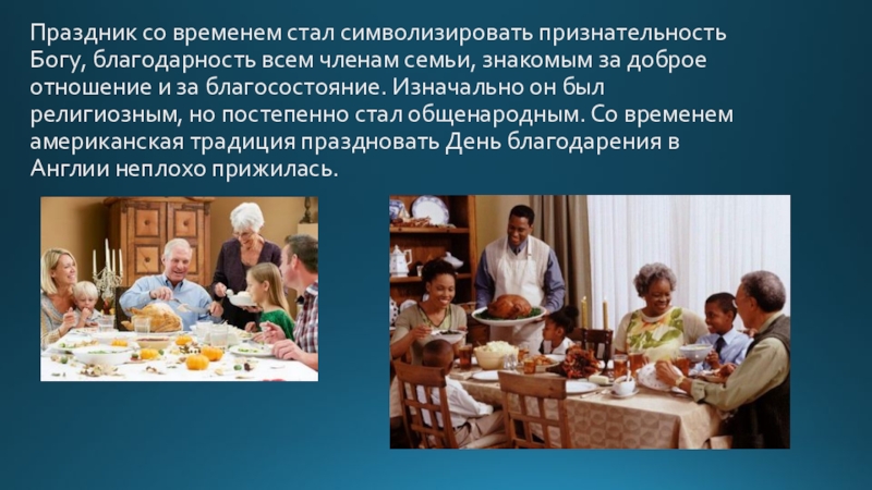 Слайд 5Праздник со временем стал символизировать признательность Богу, благодарность всем членам семьи,