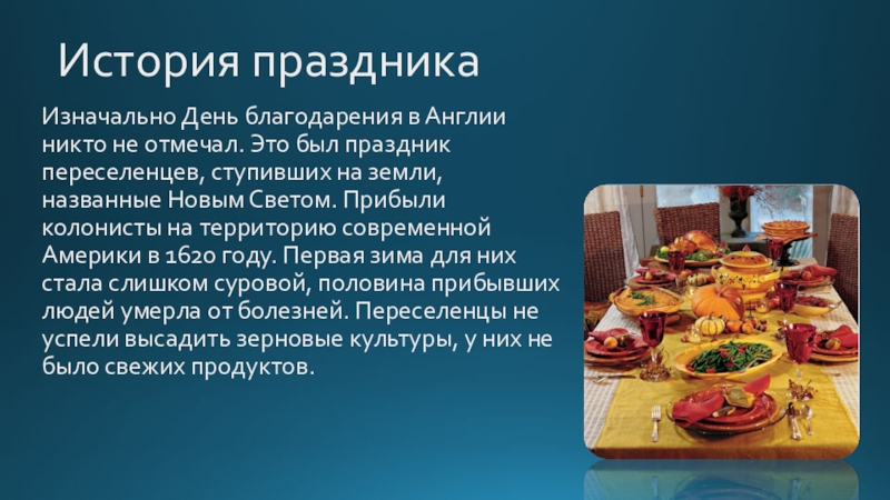 праздник переселенцев, ступивших на земли, названные Новым Светом. Прибыли колонисты на территорию современной Америки в 1620 году. Первая зима для них стала слишком суровой, половина прибывших людей умерла от болезней. Переселенцы не успели высадить зерновые культуры, у них не было свежих продуктов.