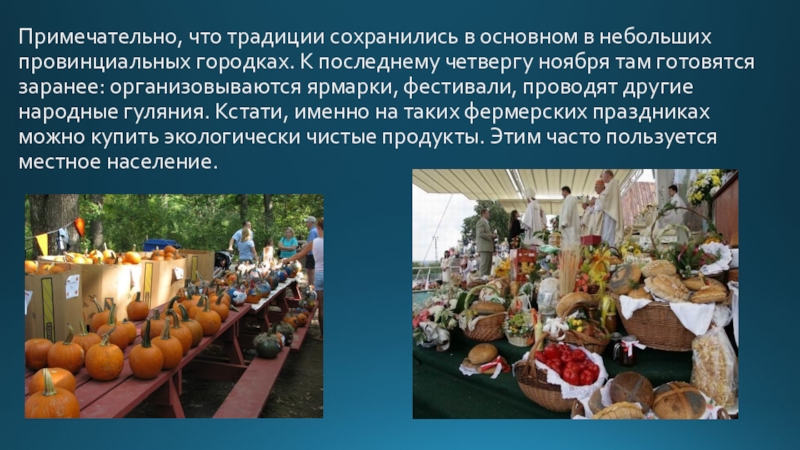 последнему четвергу ноября там готовятся заранее: организовываются ярмарки, фестивали, проводят другие народные гуляния. Кстати, именно на таких фермерских праздниках можно купить экологически чистые продукты. Этим часто пользуется местное население.