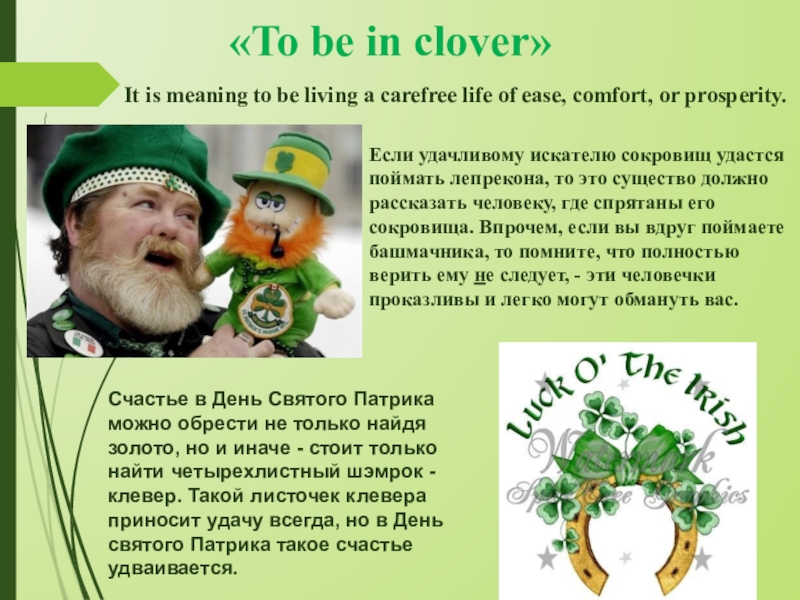 Лепреконы - персонаж ирландского фольклора, волшебник - башмачник, исполняющий желания, традиционно изображается в виде небольшого коренастого человечка, хорошо скрывающего горшок золота в конце радуги. Считается, что лепрекон ленивый, хитрый, сварливый, жадный, но может быть вполне и дружелюбным.