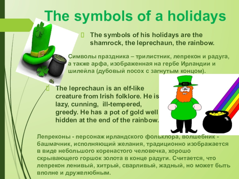 Символы праздника – трилистник, лепрекон и радуга, а также арфа, изображенная на гербе Ирландии и шилейла (дубовый посох с загнутым концом).