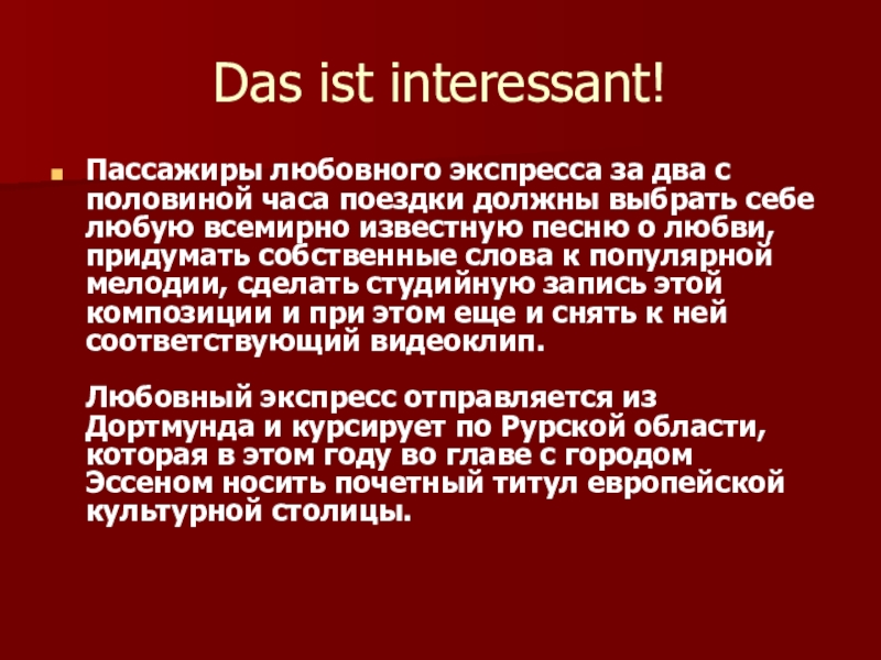 Любовный экспресс отправляется из Дортмунда и курсирует по Рурской области, которая в этом году во главе с городом Эссеном носить почетный титул европейской культурной столицы.