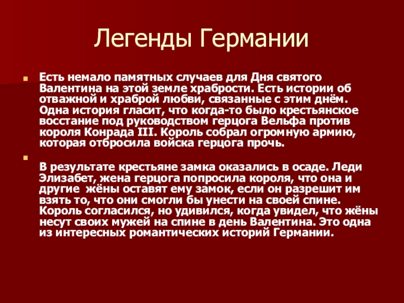земле храбрости. Есть истории об отважной и храброй любви, связанные с этим днём. Одна история гласит, что когда-то было крестьянское восстание под руководством герцога Вельфа против короля Конрада III. Король собрал огромную армию, которая отбросила войска герцога прочь.